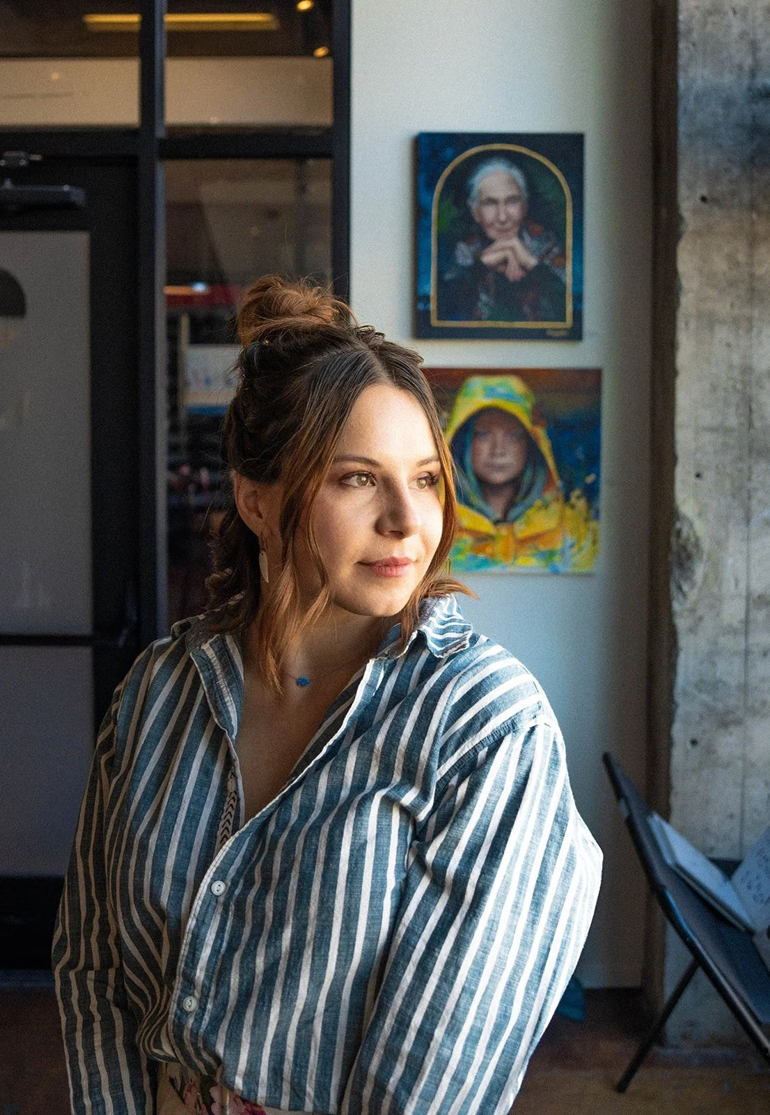 Her art challenges historical portrayals of women, offering an emotional, connected and fresh perspective through the feminine gaze paired with intensity through eye contact, color and symbols.